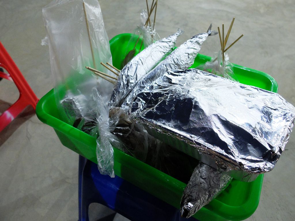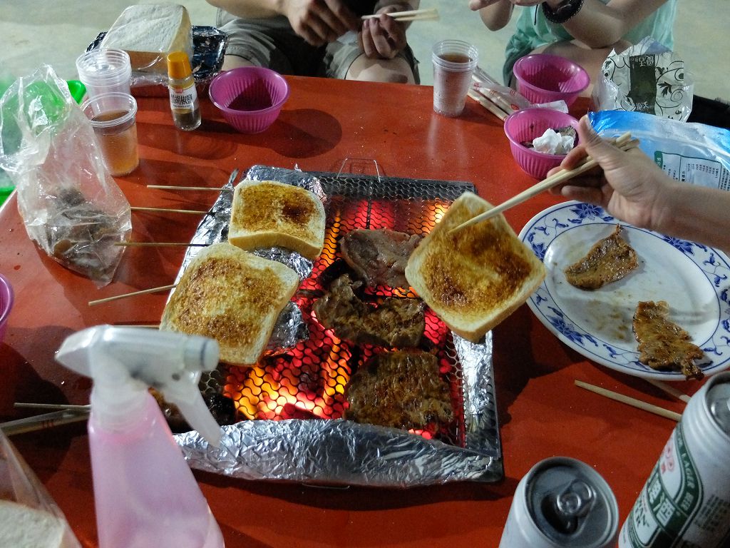 記得有醃好的豬肉、香腸、雞翅、黑輪、秋刀魚、玉米、青椒、生蚵、蛤蠣、蝦、吐司...近10餘種喔!!