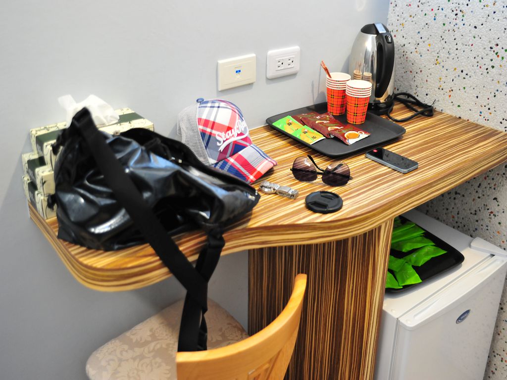 齊全的熱水壺、茶、杯及盥洗用具都備妥了!! 尤其熱水壺也好新、用的很安心。